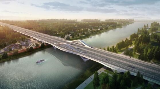安運(yùn)橋主橋設(shè)計(jì)采用梁-拱型組合體系,立意“荷香”,將荷葉形態(tài)融入到橋梁造型當(dāng)中,荷葉浮于運(yùn)河之上,整個(gè)造型宛如運(yùn)河上盛開的荷花,生態(tài)自然,與環(huán)境融為一體,給人以生機(jī)盎然、自然和諧的美感。