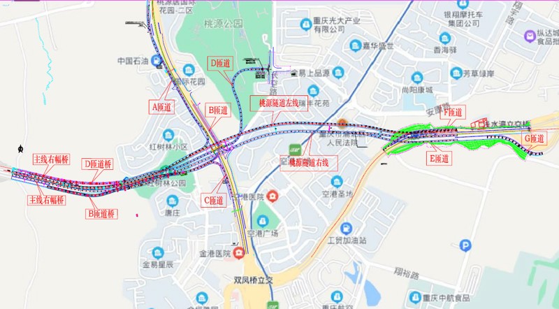 椿萱大道作為快速路五聯絡線東側的重要組成部分,是連接中心城區與外圍組團的關鍵通道。此次檢測路段起于椿萱大道與金山大道形成的蔣家山立交,止于空港東路,全長約9.2km,為城市快速路,含2座立交(桃源立交、空港東路立交),1座大橋(蔣家灣大橋),1條隧道。